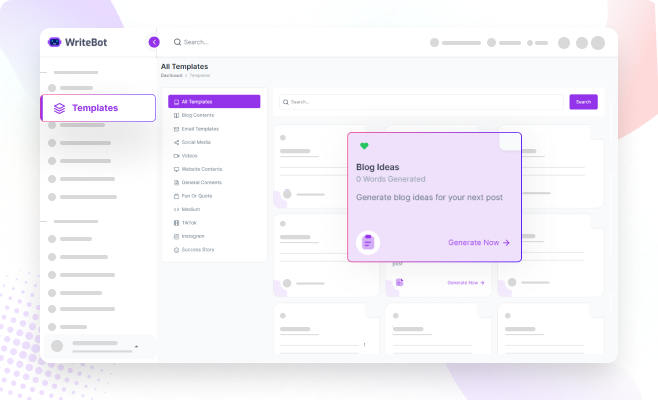 Increase the quality of your output by working with Chat by WriteBot prebuilt prompts. This helps you guide our software to better content and Choose from emails, social posts, long-form blog posts, and more!